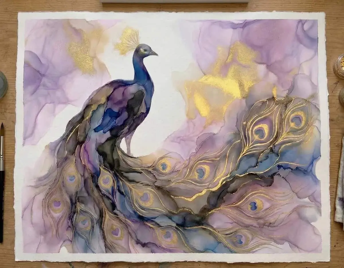 You'll build the peacock stroke by stroke — layering color, mixing on the paper, and letting each wash define the shape.